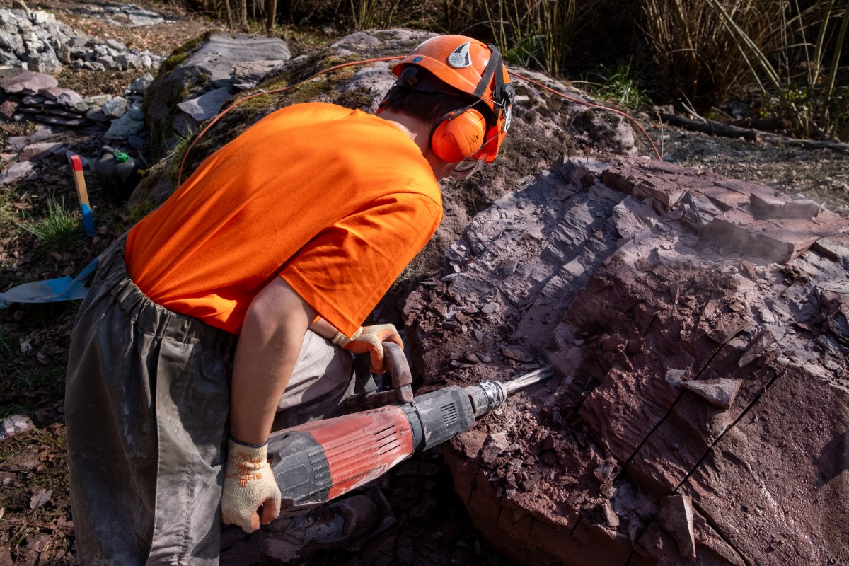 Bevor der Wanderweg angelegt werden konnte, mussten zunächst mehrere grosse Steine entfernt werden, die den geplanten Wegverlauf blockierten. Die Zivilschützer bearbeiteten die Felsbrocken mit einer Steinfräse, deren Fräsblatt mithilfe einer Wasserpumpe gekühlt wurde. Anschliessend trugen sie die einzelnen Schichten mit einem Abbauhammer ab.